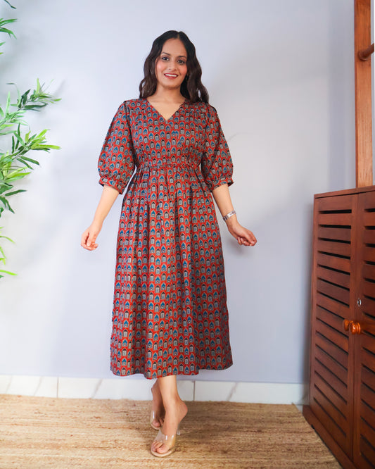 Sarah Red Polka Bagru HandBlock Print Midi Dress
