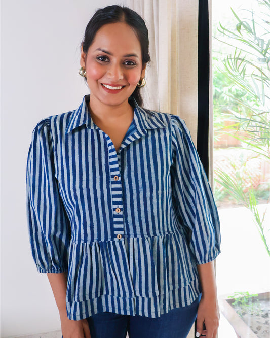 June Indigo Striped HandBlock Print Collared Peplum Cotton Top