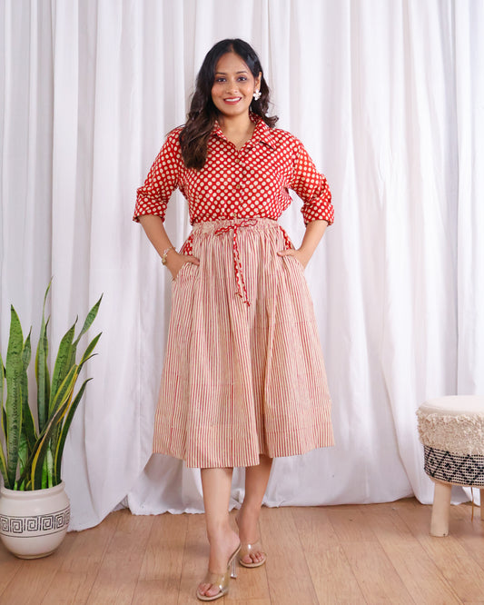 Sarah Red Striped HandBlock Bagru Print Shirt Skirt Set