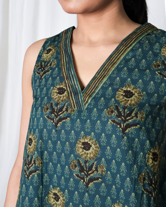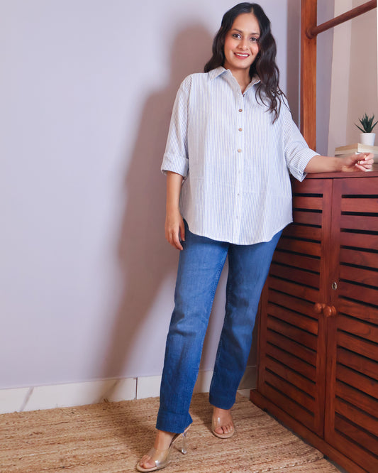 June Indigo Striped HandBlock Print Collared Peplum Cotton Top