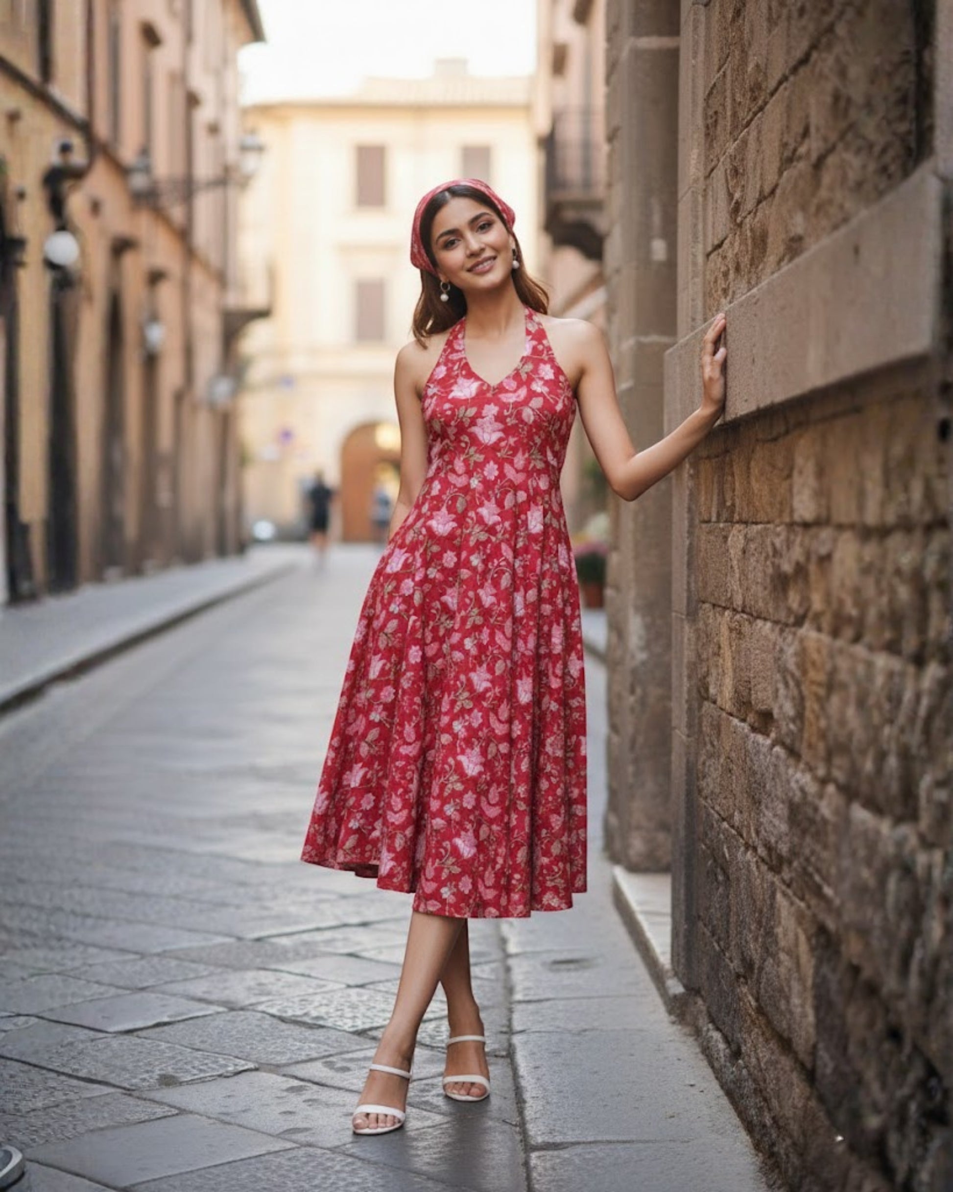 Flirty, feminine, and full of summer energy, this red handblock printed halter dress is made to steal the street. The halter neckline with an adjustable back tie frames the shoulders beautifully, while the smocked bodice hugs just right before flowing into a soft, swishy skirt. Crafted in breathable cotton and finished with pockets, it’s playful, romantic, and effortlessly eye-catching — the kind of dress that makes every walk feel cinematic. This dress is fully lined