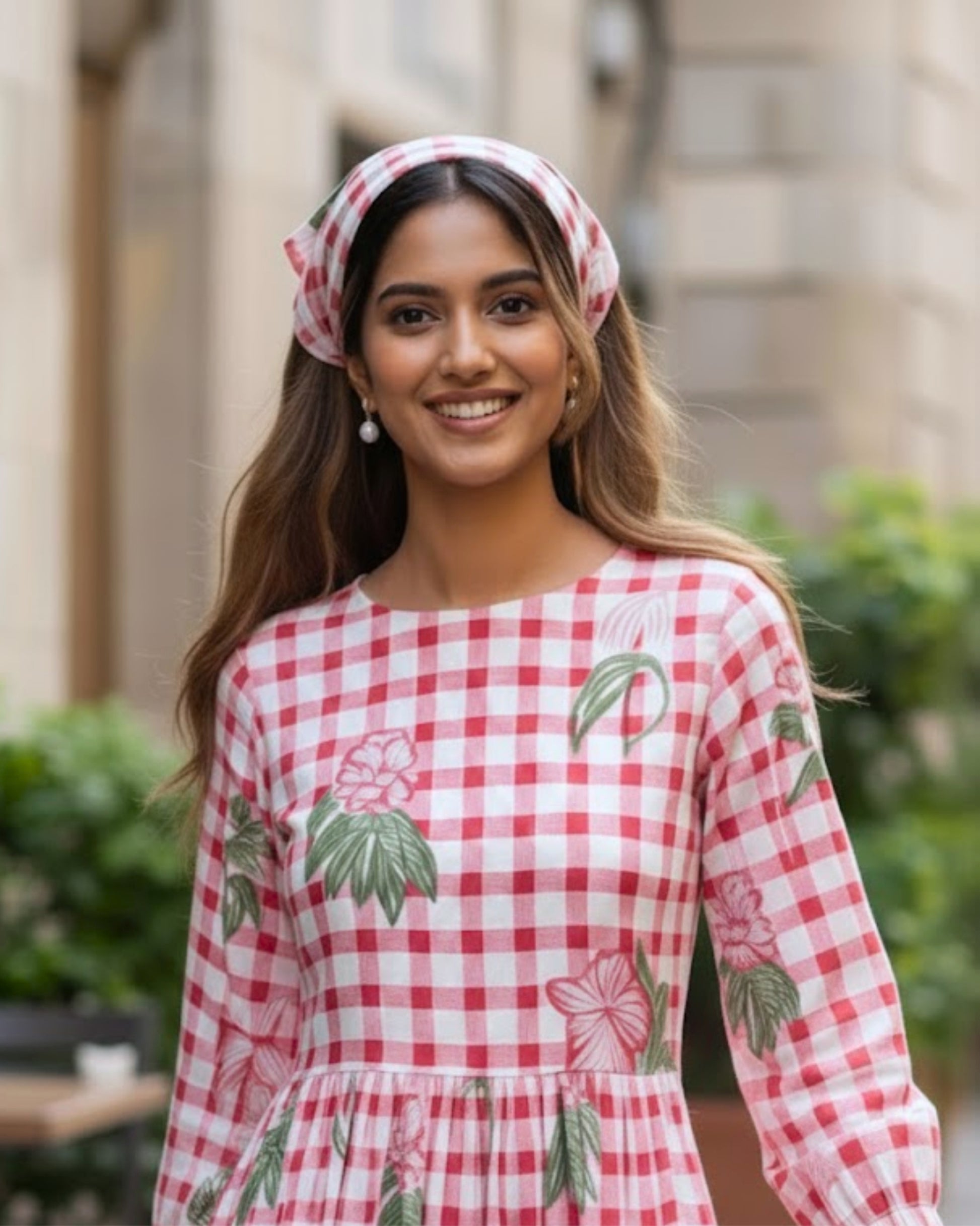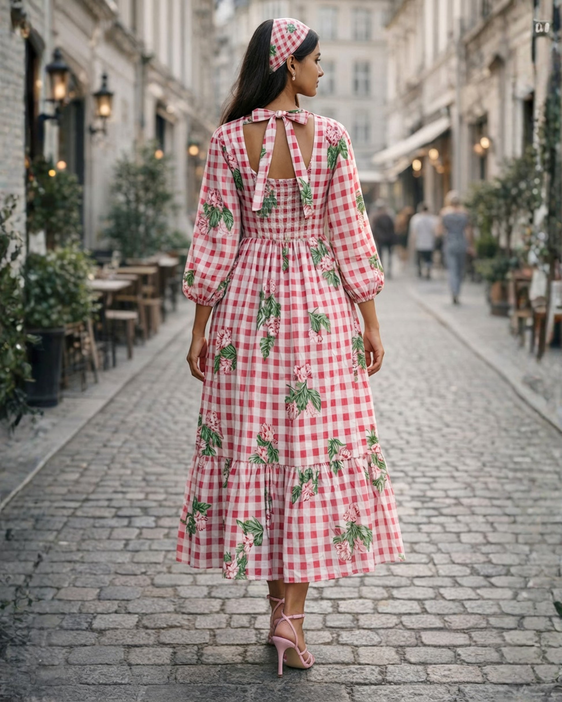 Straight out of a Pinterest board. This striking pink checkered floral dress is all things feminine. Designed with a soft round neckline, romantic puff sleeves, and flowy tiered gathers, it creates the prettiest silhouette. The smocked back with adorable tie-ups adds a playful surprise, while side pockets make it as practical as it is pretty. Easy, breezy, and irresistibly cuteāthis oneās a heart-stealer.