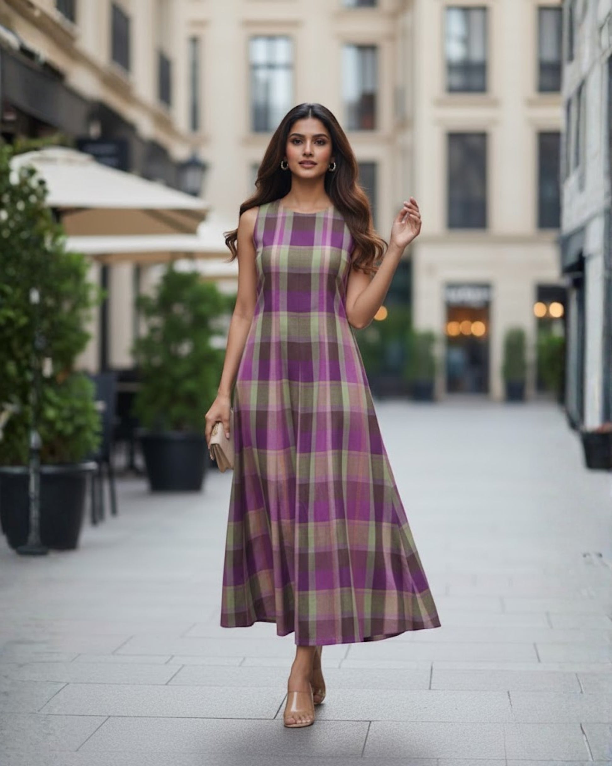 Strong lines, soft movement—this plaid dress is made for women who lead with confidence. Designed in a clean, sleeveless silhouette, it features a structured bodice that flows into a graceful A-line fall. The bold check pattern adds power and personality, while the fluid fabric keeps it feminine and effortless. Sharp yet soft, this is not just a dress—it’s a statement.