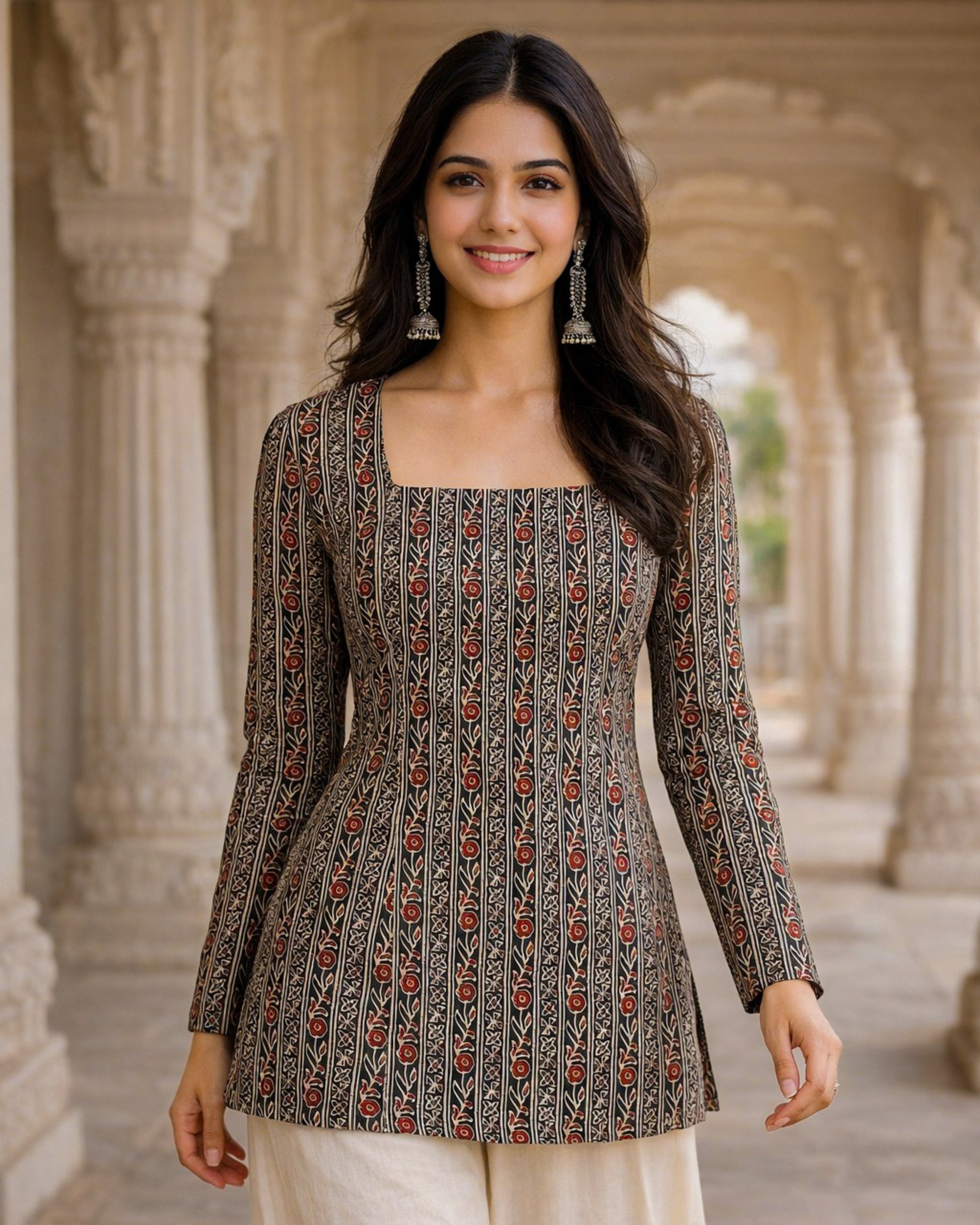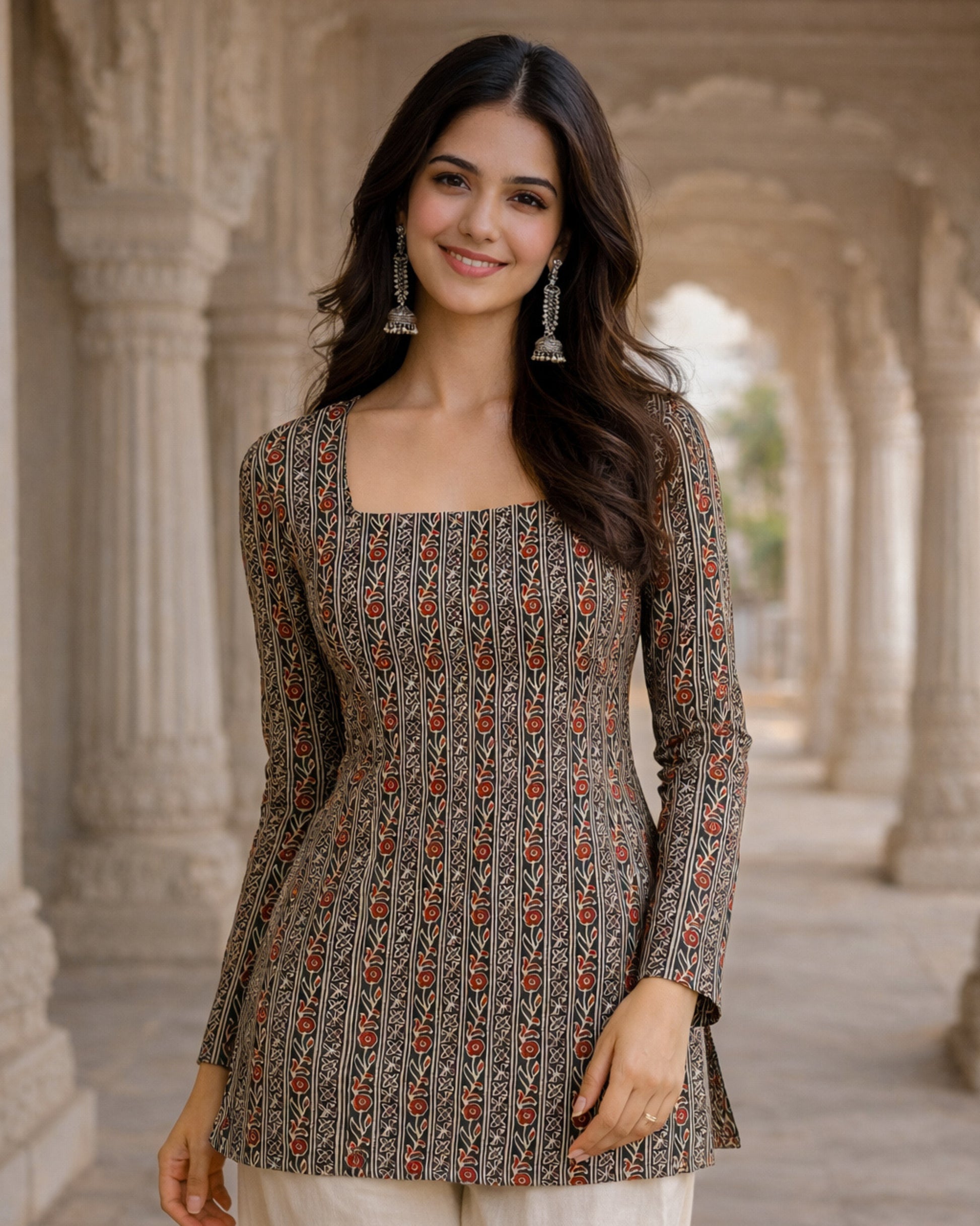Refined, rooted, and quietly striking—this ethnic printed kurti brings together heritage detail with a contemporary silhouette. Set in a deep earthy base, it features delicate vertical floral vines in muted reds and ivories, creating a lengthening, elegant effect. The structured square neckline and softly flared fit sculpt the body while allowing ease of movement, making it both flattering and comfortable.