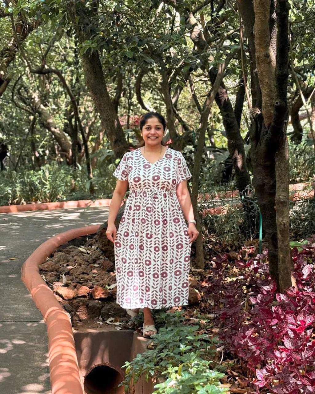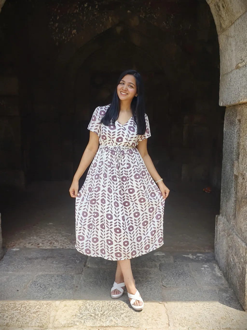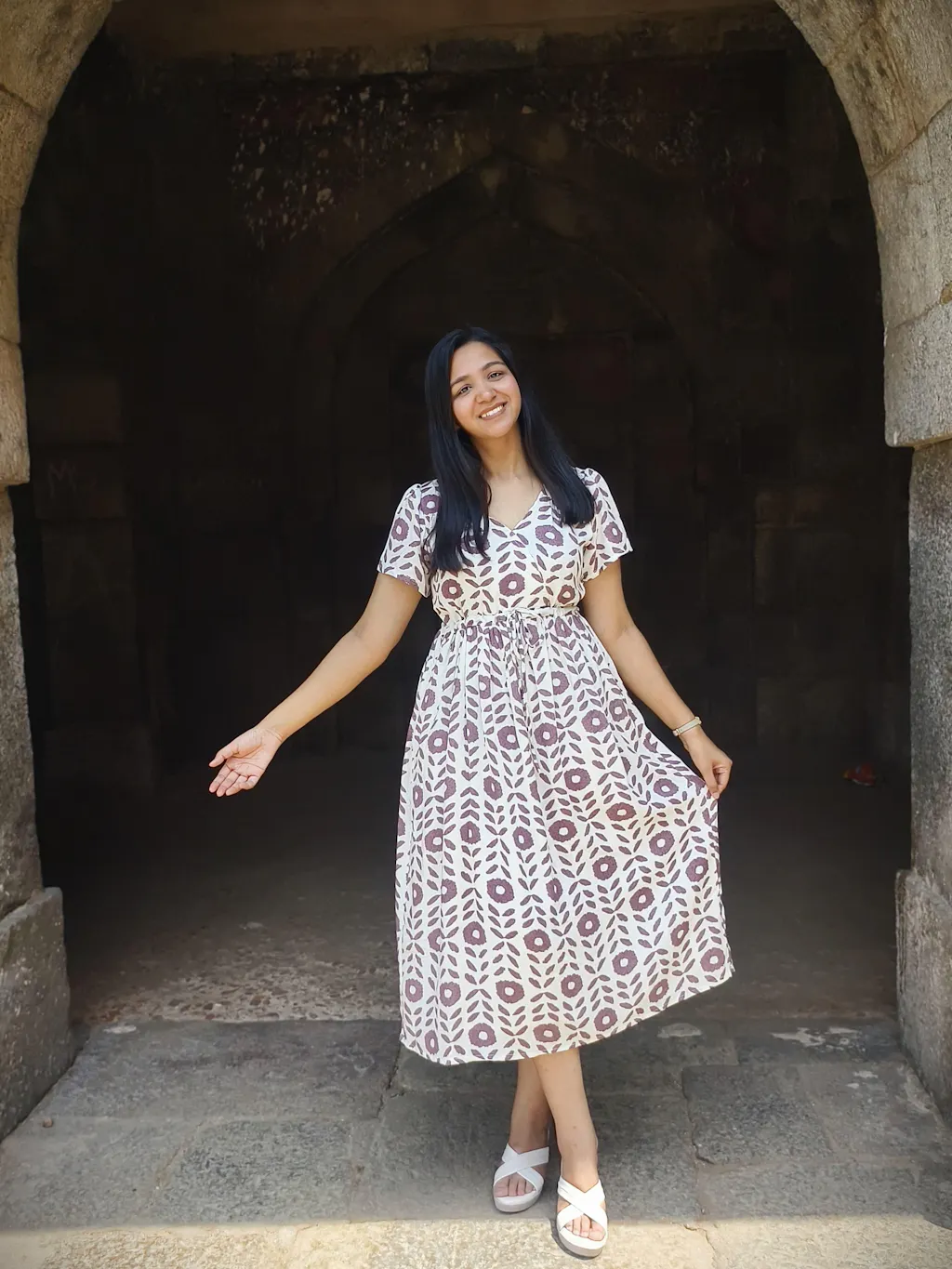 A Fit-and-Flare dress with short flared sleeves, adjustable drawstring waist ties and side pockets for ultimate comfort.