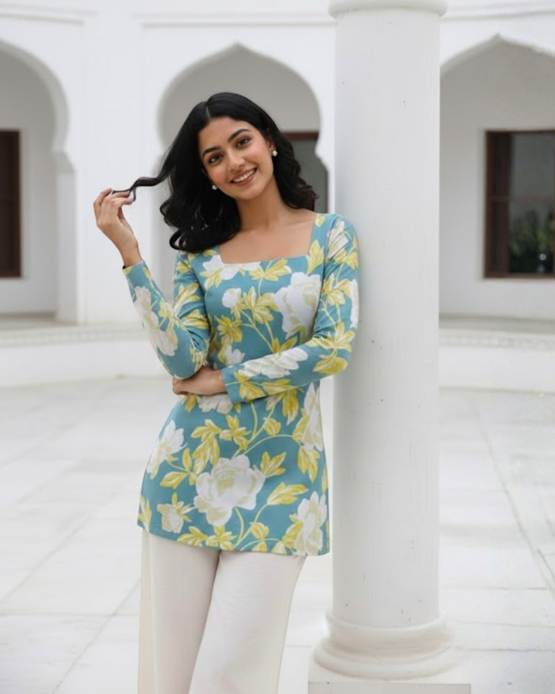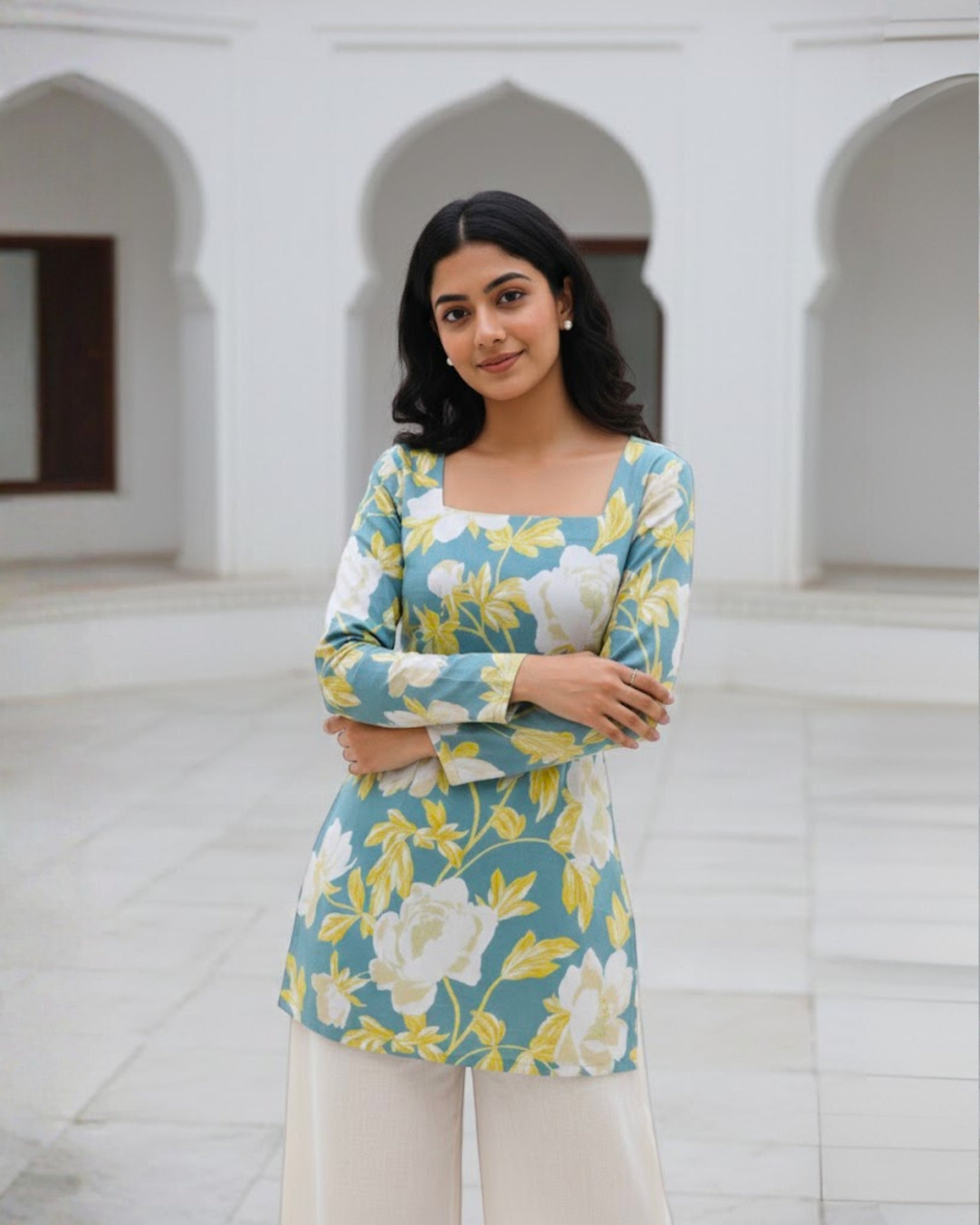 Graceful, vibrant and effortlessly stylish ā this kurti is the perfect blend of comfort and charm. Designed with a clean square neckline and full sleeves, it creates a sleek, flattering silhouette while keeping the look fresh and feminine. The soft fitted shape is elevated with corset back detail, finished with a straight hem and side slits. Sweet, modern, and endlessly wearable ā a standout piece for casual outings or festive moments