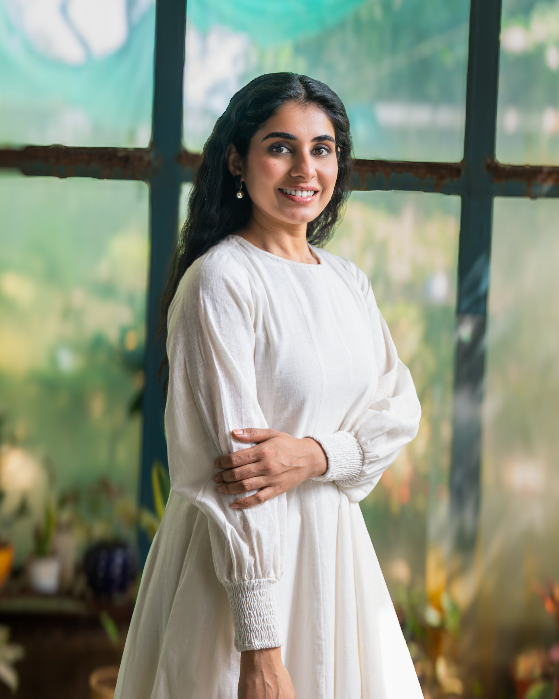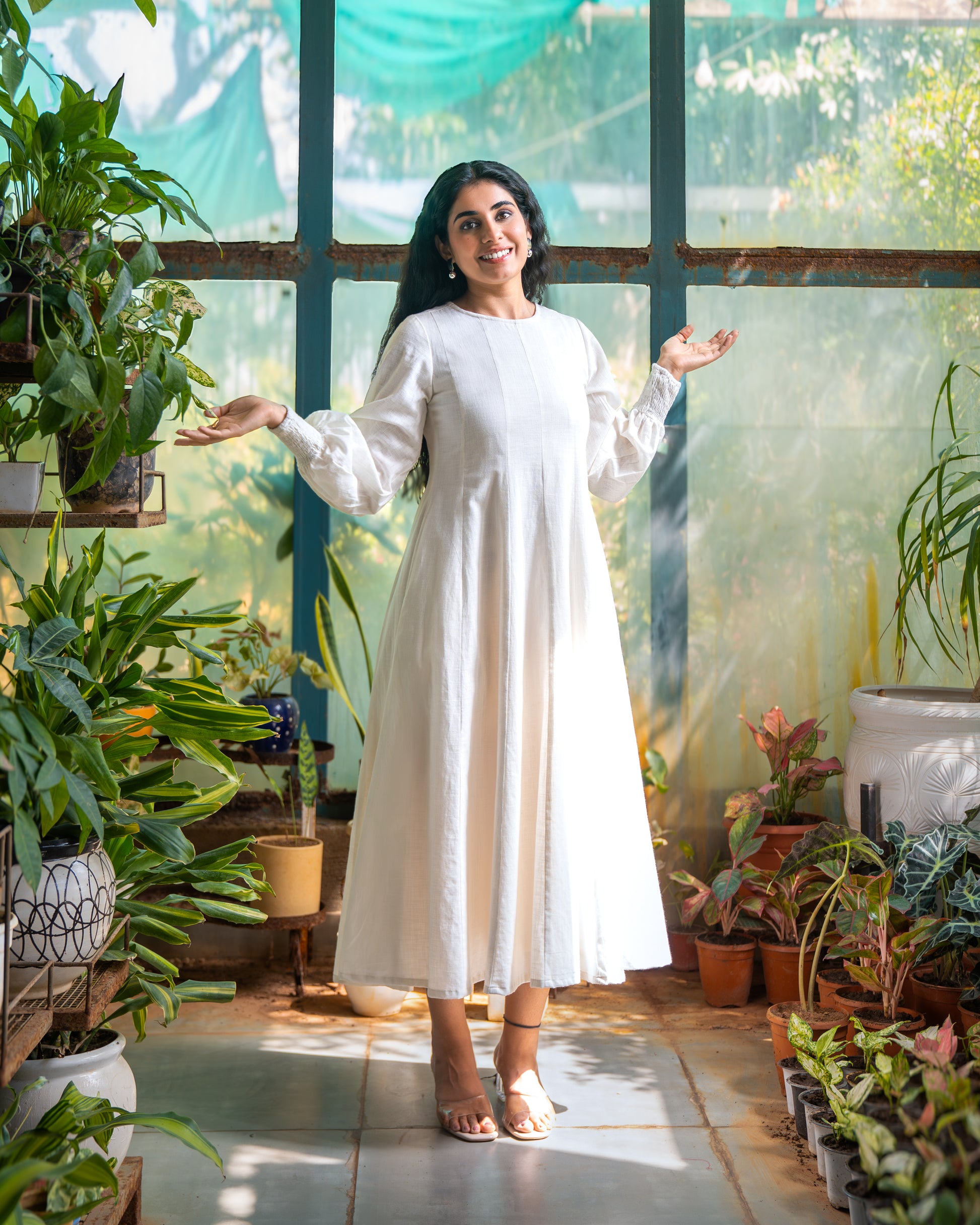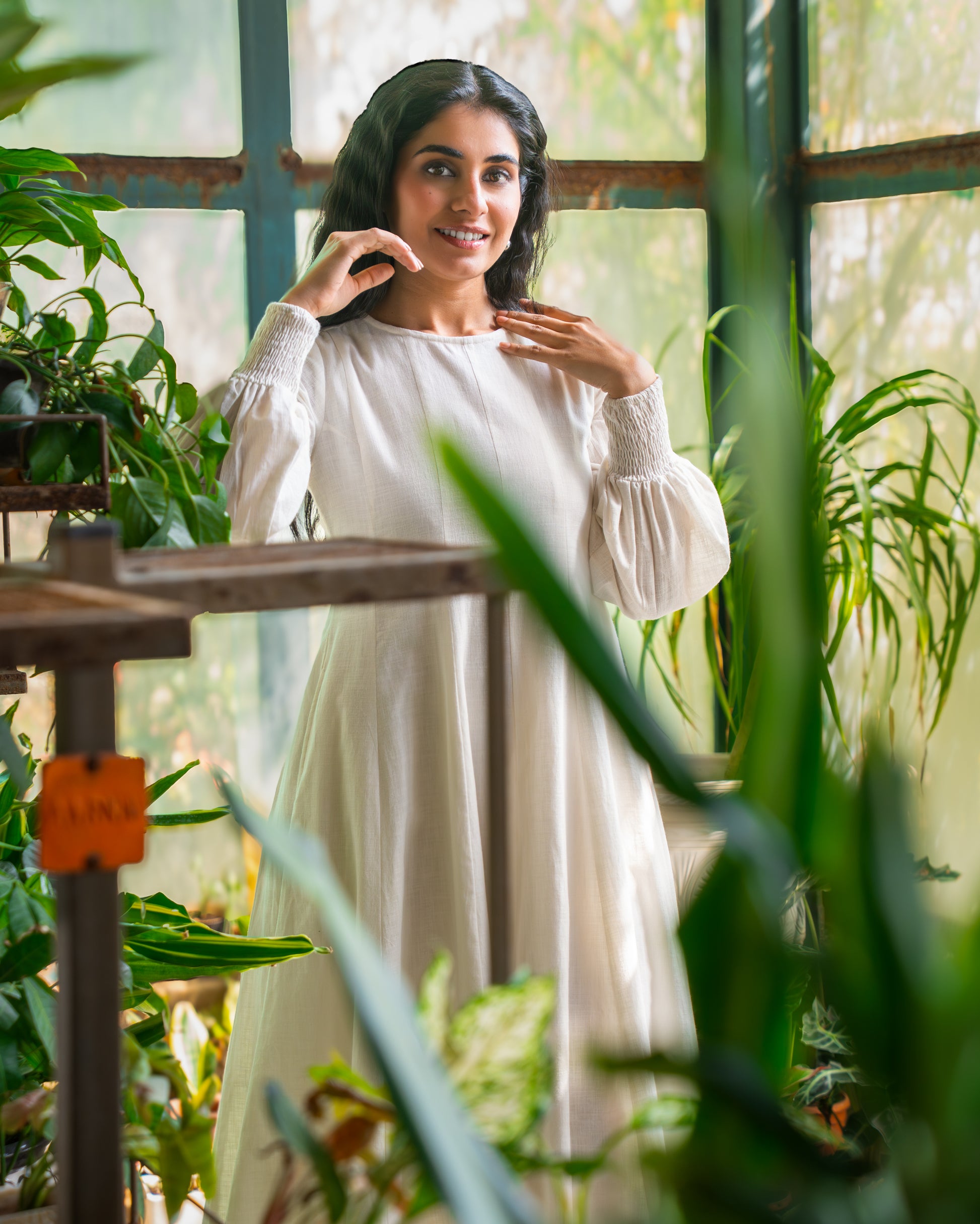 Softly structured, effortlessly refined — this ivory midi dress is designed for women who embrace elegance with quiet confidence. Crafted in a fluid, breathable fabric, it features a clean round neckline and full-length sleeves that taper into delicate smocked cuffs. The relaxed bodice flows into a graceful A-line silhouette, creating beautiful movement with every step. Minimal yet impactful, it’s the kind of piece that speaks through simplicity. Sharp in its tailoring yet gentle in its fall, this is not just a dress — it’s understated power.