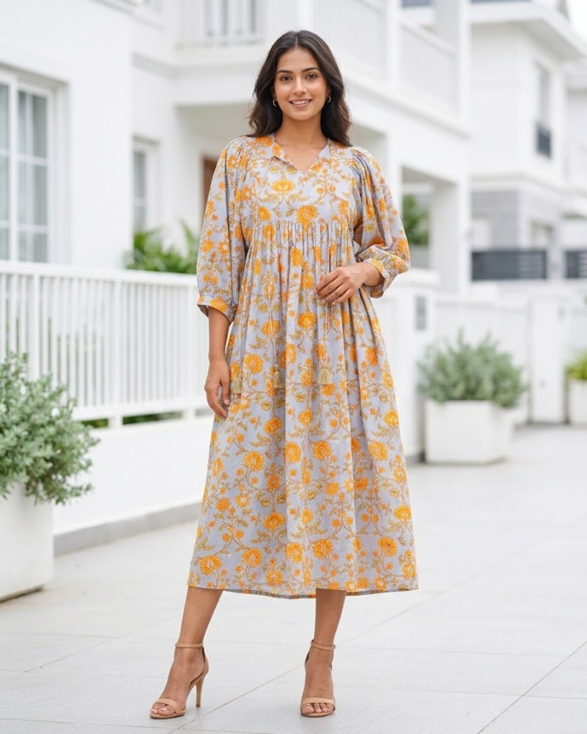 Cut in pure cotton handblock printed fabric, it features a round neckline, puff sleeves with elasticated cuffs, front keyhole opening with drawstring and handmade tassel ends, and side pockets for ultimate comfort.